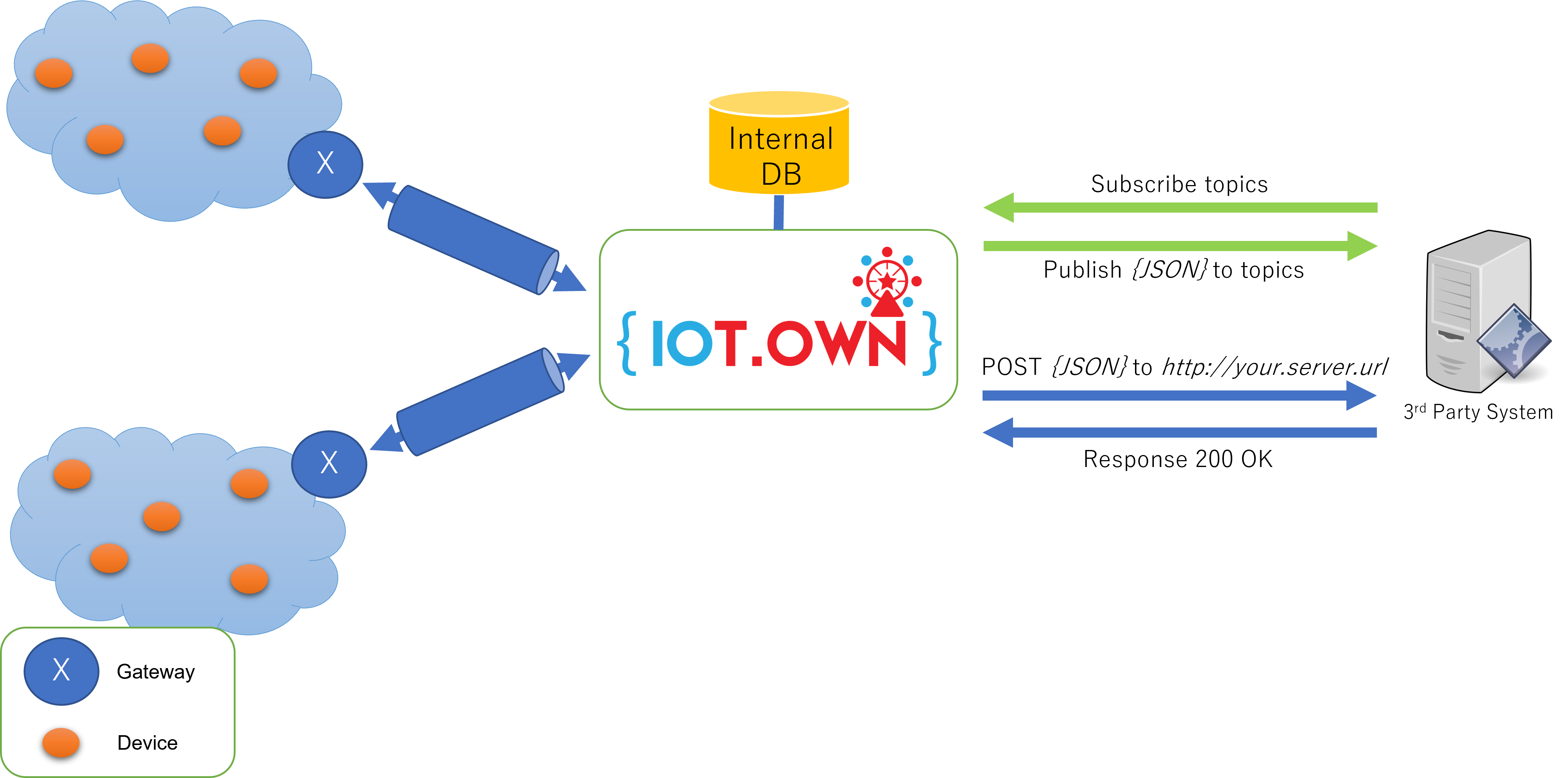 Callback은 IOTOWN으로 전송되는 단말 장치의 데이터를 서드파티 시스템으로 전달하는 기능을 말합니다. IOTOWN은 MQTT와 HTTP 프로토콜을 이용하여 callback을 수행합니다.